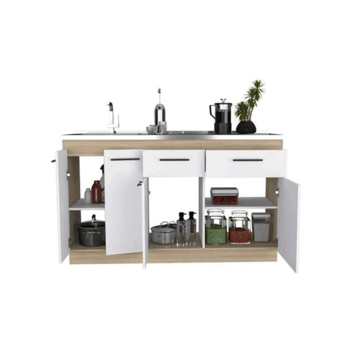Mueble Inferior Belmira Rovere y Blanco 150 cm. Gabinete Inferior, con 4 puertas batientes, 2 cajones, manijas metálicas. No incluye el fregadero (mesón) [ ...ver más ]